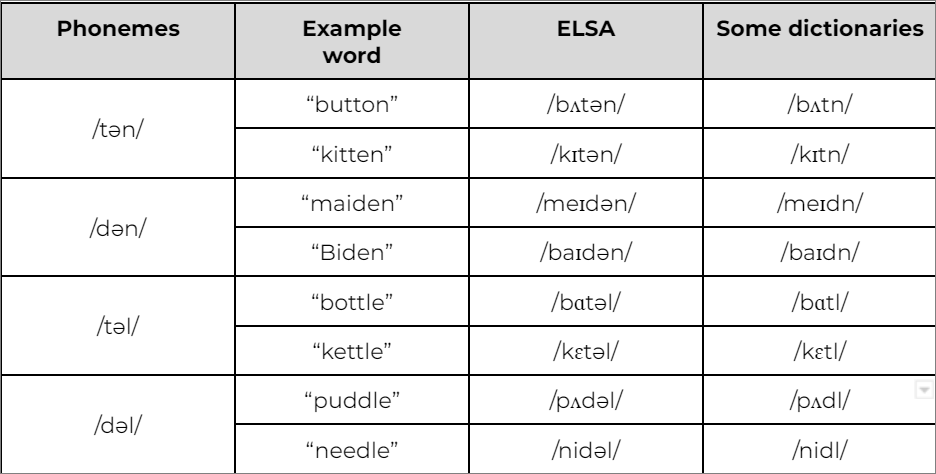 Schwa can often be dropped in some predictable contexts.. Some dictionaries prefer to represent these words with the schwa, while others prefer the version without it. ELSA uses the transcription with the schwa, but always accepts both variants.