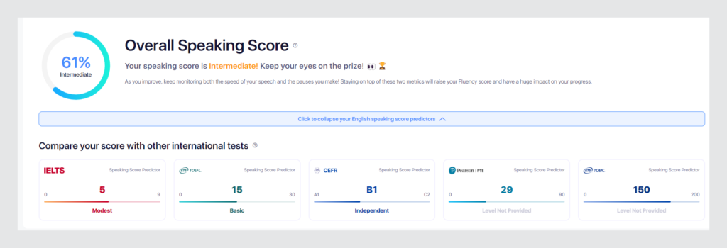 ELSA’s Overall Speaking Score measures your spoken proficiency in English.