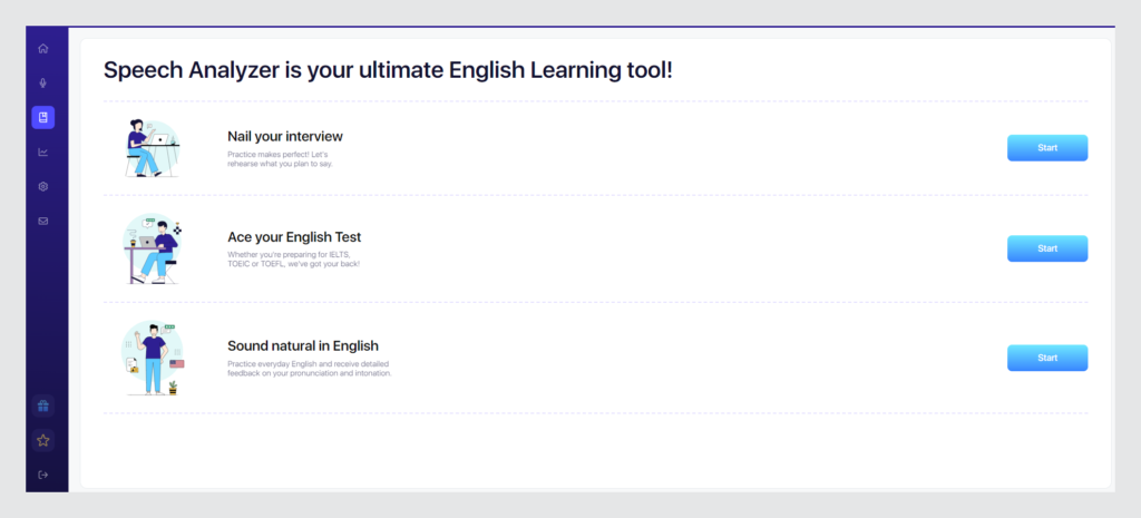 Prepare the speech you want to practice, open ELSA Speech Analyzer in your web browser, and turn on the recording. Start your speech or freely speak your mind and let ELSA Speech Analyzer listen to your speech. Review your speech and take notes to improve. Practice multiple times for improvement.