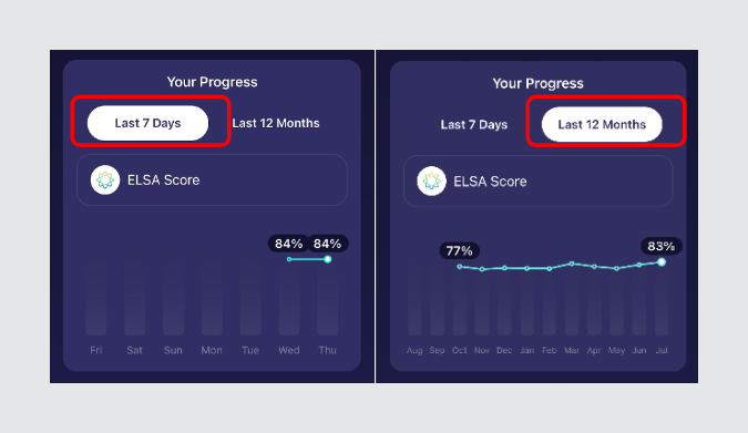 View your ELSA Score improvement in the last 7 days and 12 months.