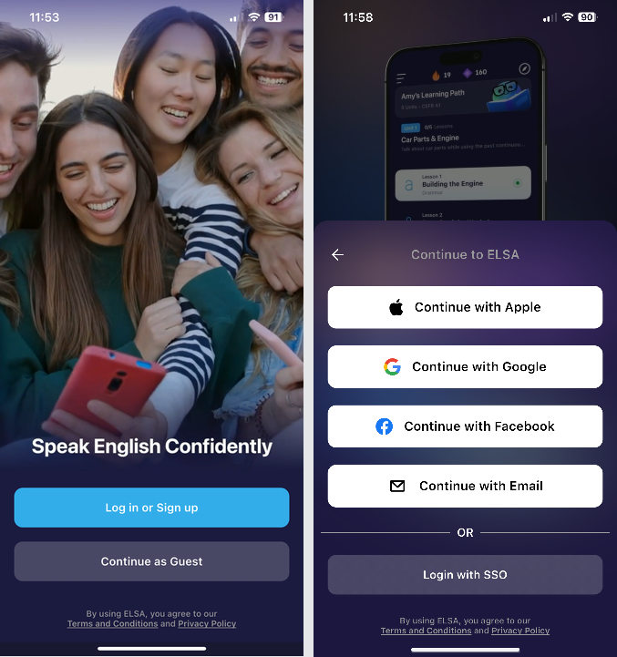 Step 2: Open the ELSA application on your device. Choose Log in or Sign Up > choose one of the 4 options (Apple, Google, Facebook, Email) to log in depending on how you initially registered your account.