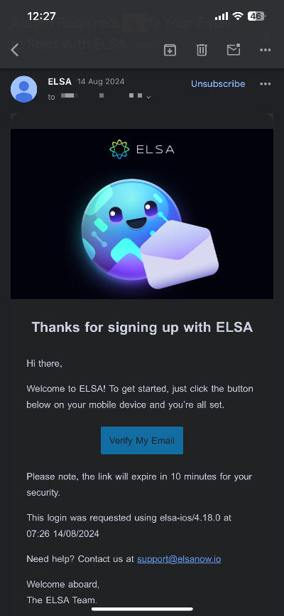 You are required to verify your email address. Verifying your email is an essential step to ensure the security of your ELSA account, confirm your ownership, and allow us to send important updates or recovery options if needed. It also helps prevent unauthorized access and ensures a seamless account experience.
