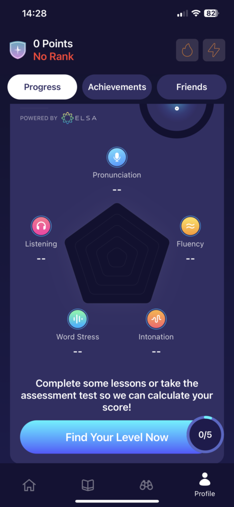 As you start out with ELSA, you will be prompted to take an assessment test to evaluate your current English proficiency level based on your strengths and areas for improvement in your pronunciation.